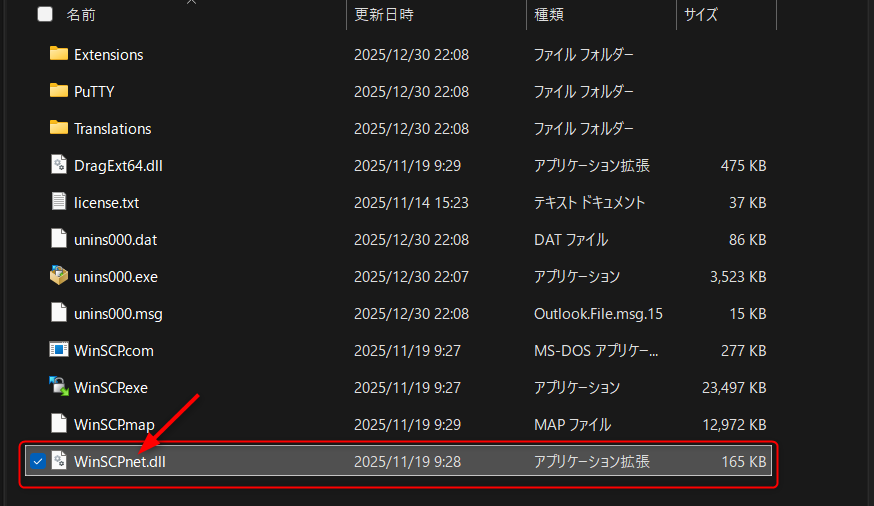 インストール」フォルダを開いて「WinSCPnet.dll」が含まれていることを確認します。