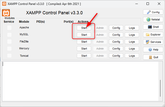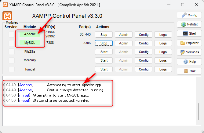 - Apache/MySQLともに緑色がつき、runnningとなっていることを確認