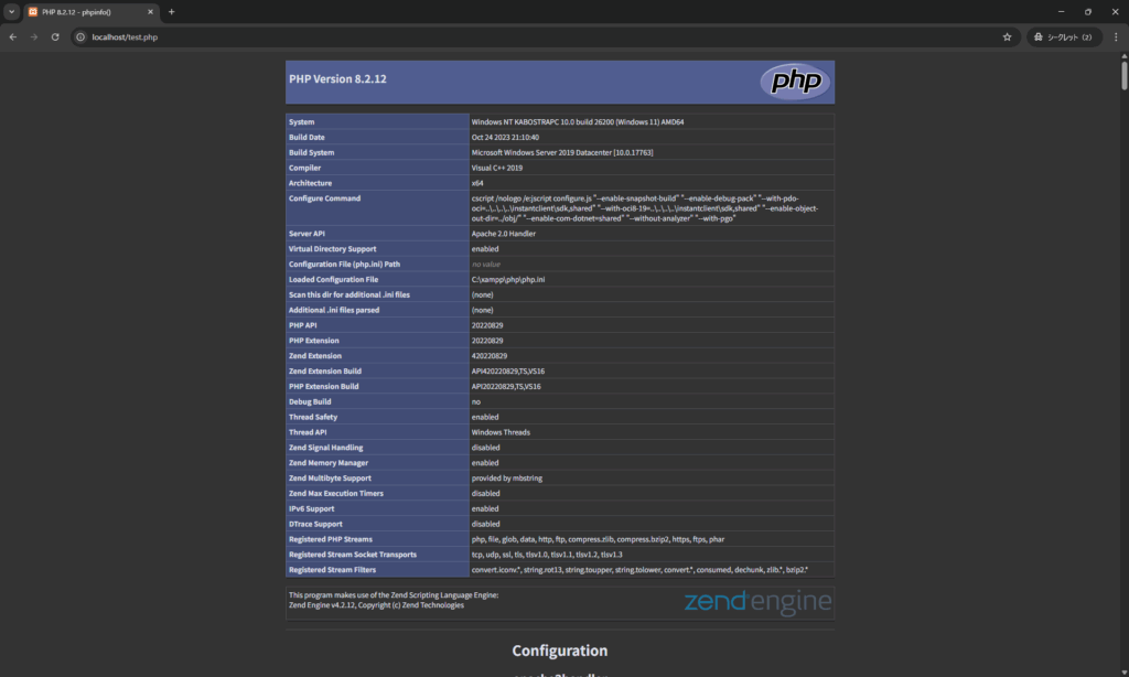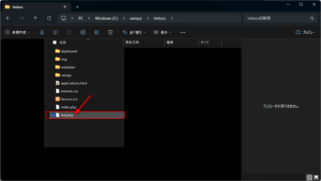 - C:\xampp\htdocs(デフォルトのドキュメントルート)にtest.phpを作成